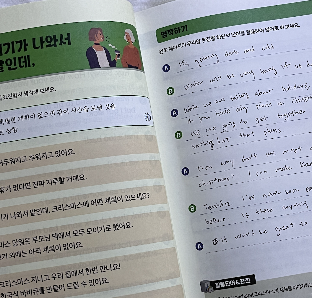 어떤 표현을 배울 때 '지금 나는 그 말을 영어로 어떻게 하는가'를 써 보는게 되게 큰 도움이 되더라고요. 늘 셀리 선생님도 써보는 걸 중요하게 여기시던데 책도 그렇게 구성이 되어 있어서 좋았어요. 아무도 안보니까 진짜 투명한 제 영어 실력이 드러나지만 뒤에 설명 들으면서 아하! 깨닫는게 진짜 중요해요.