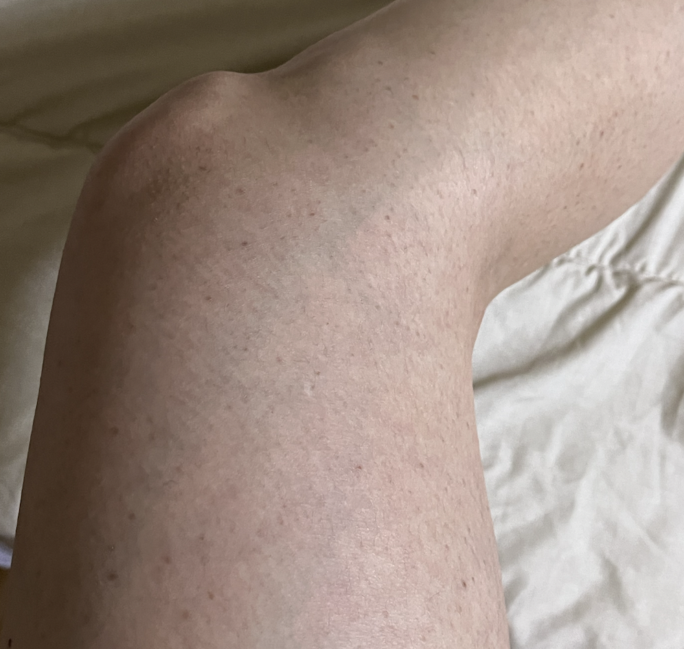 하지만 제일 기대했던 모공각화증은 개선 효과는... 글쎄요. 눈에 띄는 효과는 아직까지 없었습니다. 아래 사진은 첫날부터 13일 경과 사진까지 순차적으로 찍은 사진입니다. 보시다시피 울긋불긋 오돌토돌한 상태가 여전히 유지되고 있습니다. 실물로 보는 것보다 사진이 더 적나라하게 닭살 피부를 보여주네요. 아마도 저는 반바지를 입을 때 쯤이면 속살패드를 구매해서 추가로 사용하지 않을까 싶습니다.