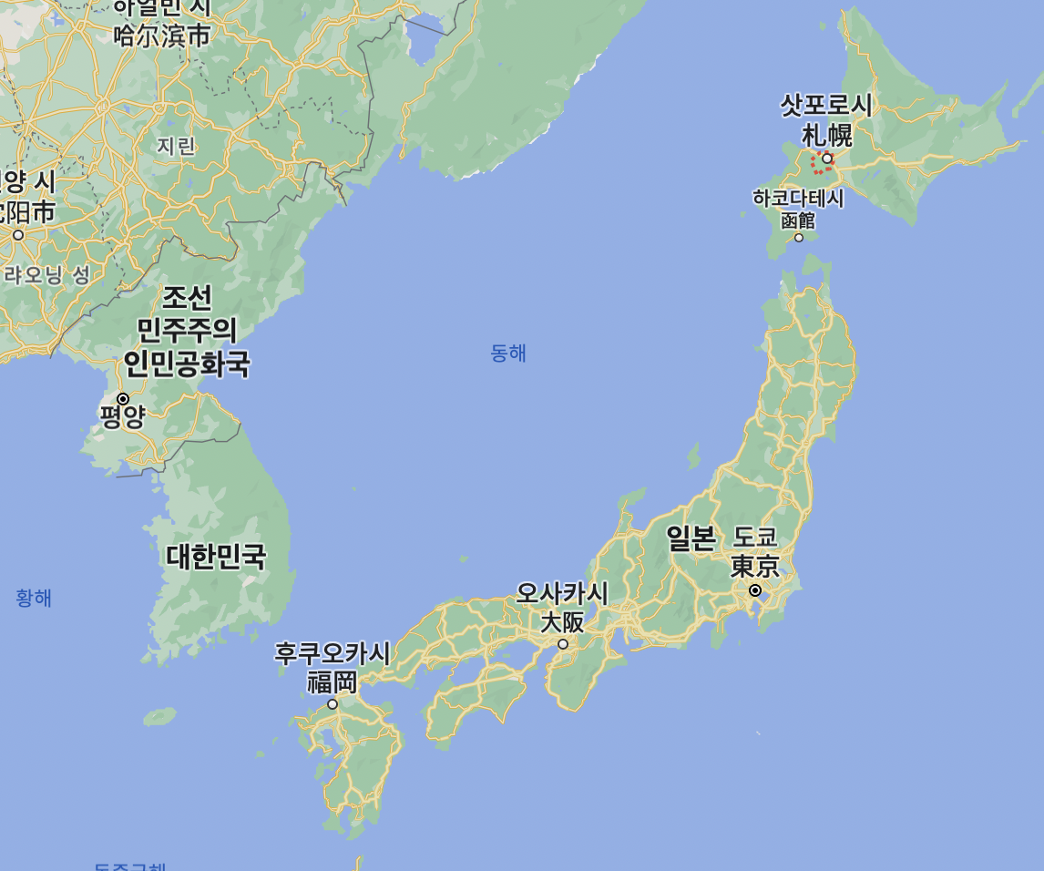 삿포로는 일본에서 훗카이도에 위치하고 있습니다. 훗카이도는 일본 4개의 섬 중 하나인데요. 가장 북쪽에 위치하고 있습니다. 그래서 한국에서 갈 때도 비행 시간이 다른 일본 지역에 비해 조금 더 걸리는 곳입니다. 인천 기준 2시간 40분 ~ 3시간 정도 소요된다고 보시면 됩니다. (부산도 비슷하게 걸리네요.)