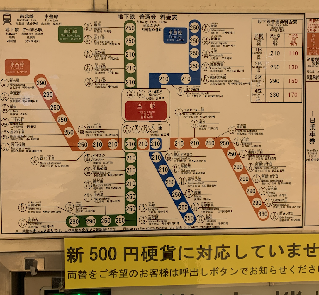 자, 이제 그럼 지하철 표를 사야하는데요. 아래 지하철 노선도를 보면 210 이렇게 써있는게 보이실 거예요. 스스키노가 210이라고 되어 있는데 210엔짜리 표를 사라는 의미입니다.