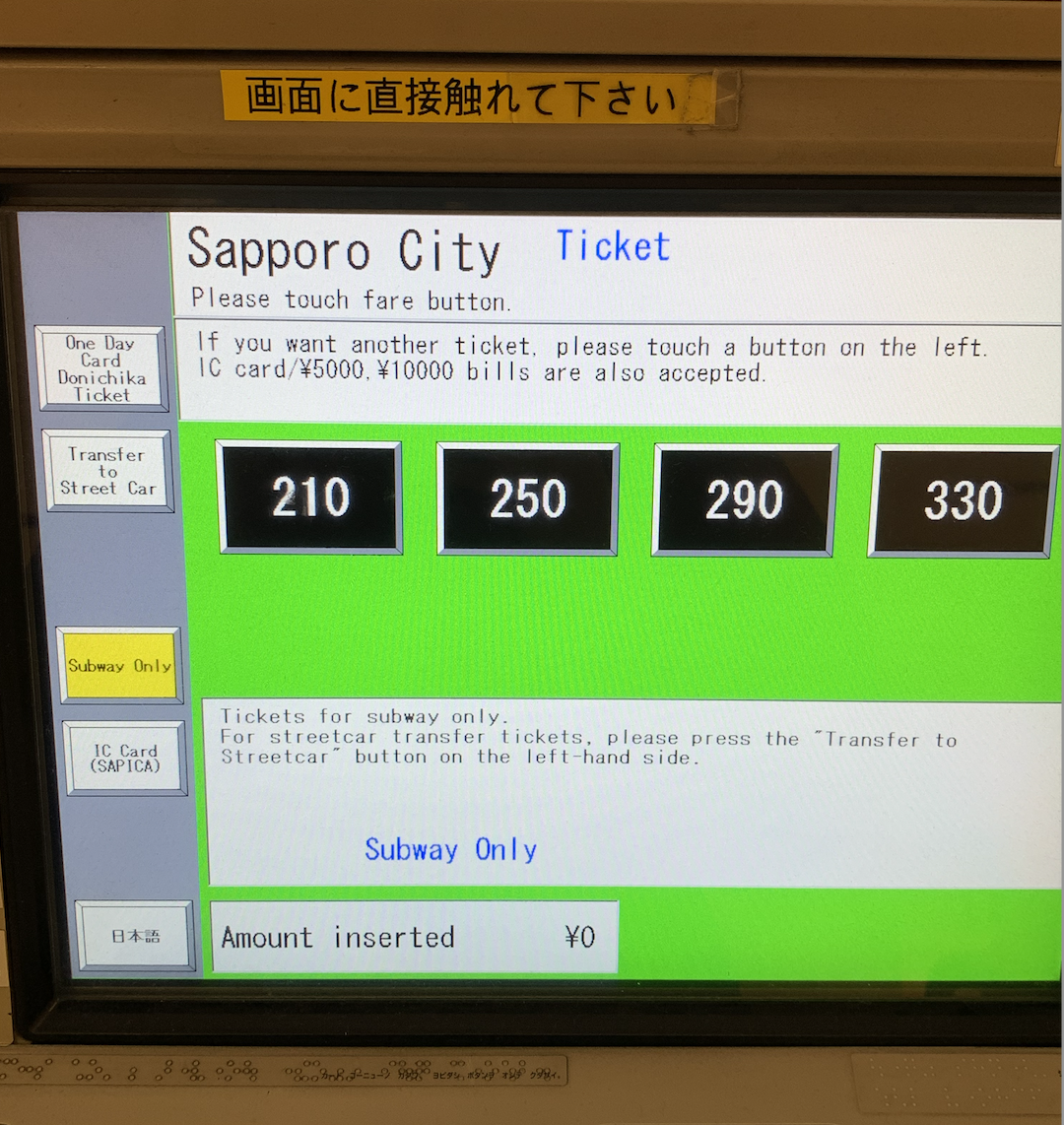 subway only 를 누르고 210엔짜리를 누른 후 현금을 넣으면 됩니다. 그럼 아래처럼 지하철 표가 나올거예요.