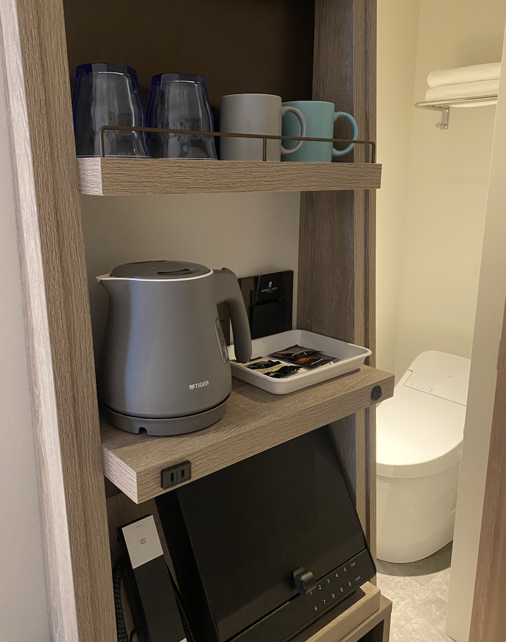 딱 기본 일본 숙소 구조입니다. 침대 두 개에 작은 테이블이랑 1인이 앉을 수 있는 쇼파가 있습니다. 티비도 있습니다만 본 적은 없어요. (와이파이 비밀번호는 티비를 켜면 오른쪽 밑에 나와 있습니다.) 화장실은 샤워실이 구분되어 있습니다. 기본적인 어메니티는 체크인 하고 올라오기 전에 엘리베이터 앞에서 필요한 만큼 가져오면 됩니다. 티백이랑 컵, 포트, 냉장고도 구비되어 있습니다. 옷장은 별도로 없습니다.
