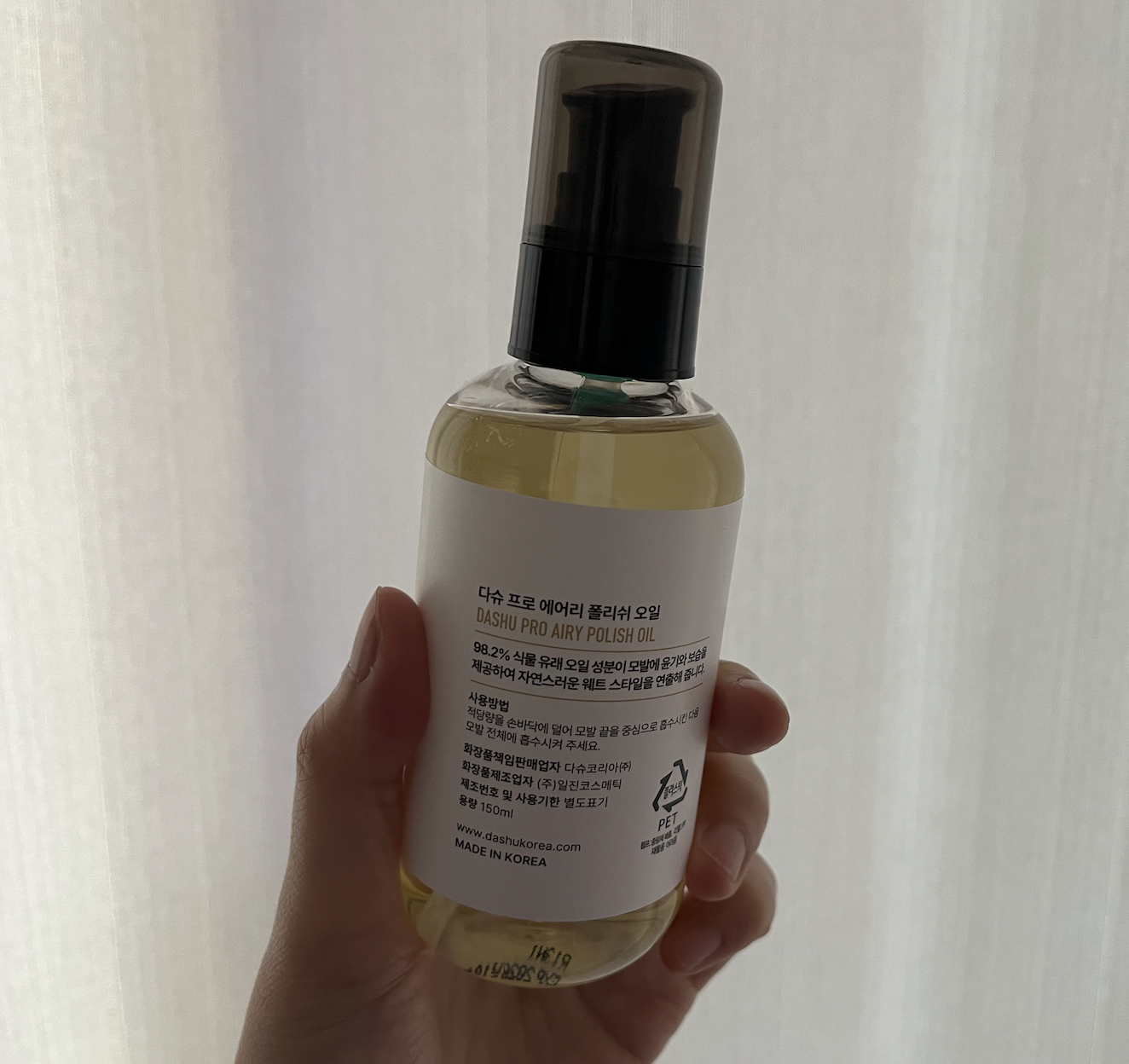 폴리쉬 오일은 모발의 질감을 촉촉한 느낌으로 마무리 시켜주는 오일을 의미합니다. 그래서 태슬컷 같이 모발의 끝을 강조되었으면 하는 스타일에 잘 어울리는 것 같아요. 다슈 폴리쉬 오일의 경우 98.2% 식물 유래 성분이 들어가 있어 건강하게 모발을 케어할 수 있다고 합니다.