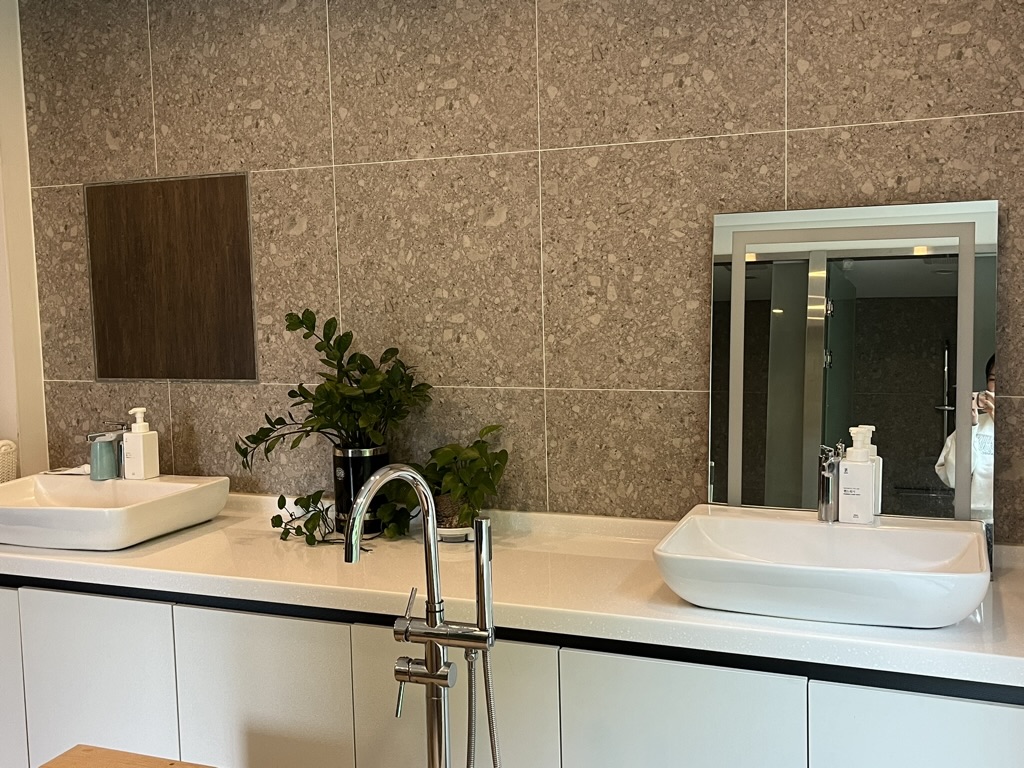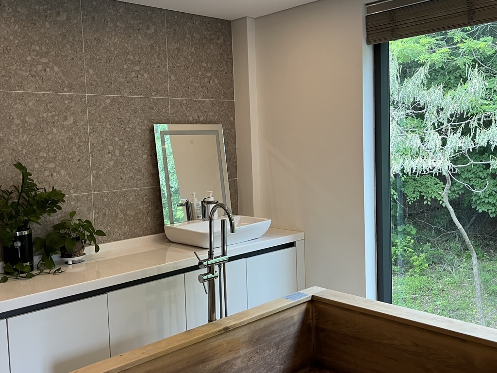 아 너-무 좋았어요. 솔직히 히노끼탕 없었으면 좀 아쉬울 뻔 했는데. 밥 맛있게 먹을 동안 물 받아 놓고 들어가서 지지는데 하- 힐링 그 자체. 히노끼 탕 한 쪽이 기울어져 있어서 편하게 등 기대고 멍 때리기 좋더라고요. 그리고 세면대가 2개나 있어요 ㅋㅋ 물론 저는 한군데만 쓰긴 했지만. 샤워실이랑 변기랑 따로 구분되어 있어서 그 점도 편하고 좋았어요.